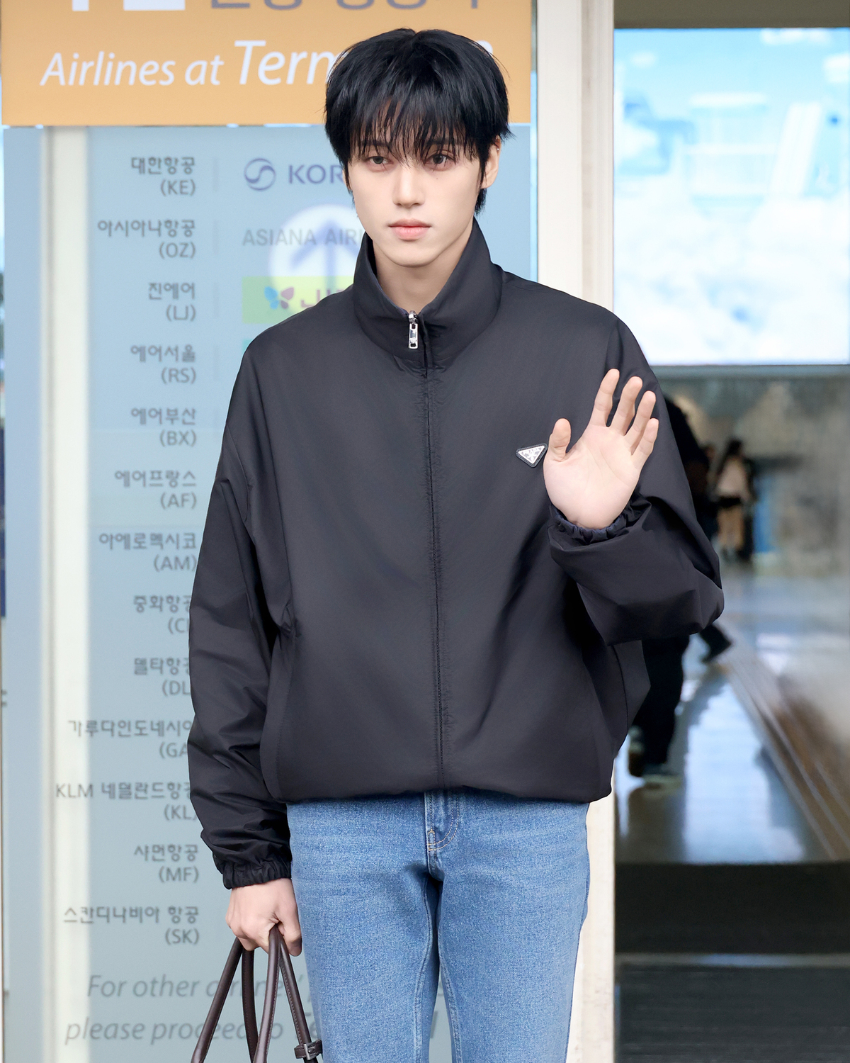 이날 미니멀한 디자인이 돋보이는 리나일론 재킷과 클래식 핏 데님 팬츠, 스피드록 메시 스니커즈를 착용해 캐주얼한 룩을 완성했으며, 여기에 벨트가 돋보이는 스웨이드 소재의 버클백을 매치해 포인트를 더해주었다.