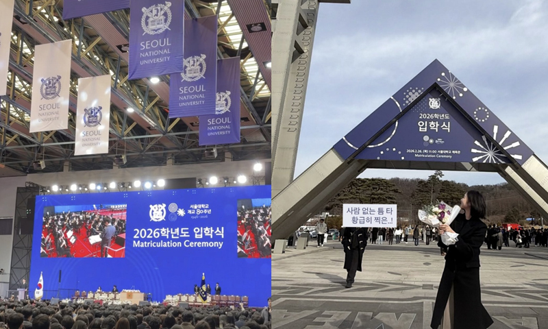 공개된 사진에는 서울대에서 열린 2026학년도 입학식 전경과 정문 앞에서 꽃다발을 들고 서 있는 신지효의 모습이 담겼다.