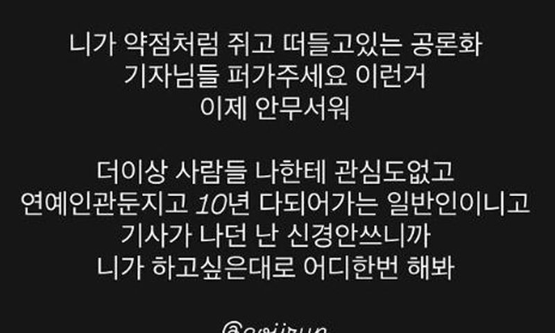 이에 대한 동호의 반응은 강경하다. 동호 역시 SNS를 통해 “정신 똑바로 차리고 살라”며 “끝까지 해보자는 거면 해보자”는 태도로 반응했다. 자신은 “연예인을 그만둔 지도 10년 다 돼가는 일반인”임을 강조하며 “기사가 나든 난 신경 안 쓰니까 네가 하고 싶은 대로 어디 한번 해 봐”라고 말했다. 또한 A씨의 비난에 대해 정확한 반박이나 해명은 하지 않았다.