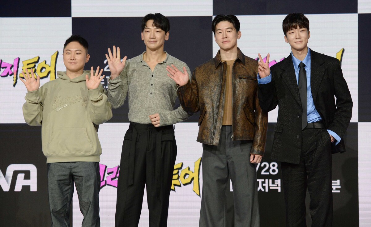 유튜버 빠니보틀, 가수 비(정지훈), 배우 김무열, 가수 이승훈(왼쪽부터)이 27일 마포구 상암동 쇼킹케이팝센터에서 열린 ENA 예능프로그램 '크레이지 투어' 제작발표회에 참석해 포토타임을 갖고 있다.