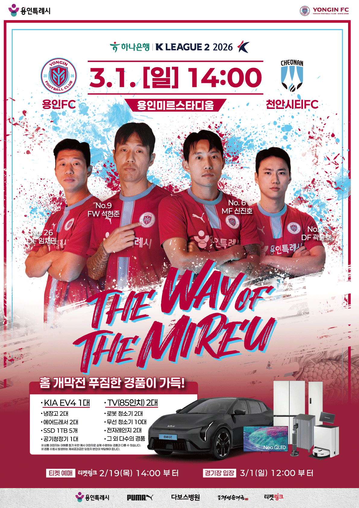 프로축구 K리그2 용인FC가 1일 오후 2시 용인미르스타디움에서 천안시티FC를 상대로 하나은행 K리그2 2026 1라운드를 치른다.