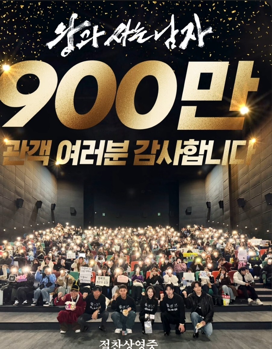 800만 관객 돌파 하루만에 900만 고지를 넘어섰다. 쇼박스는 이날 오후 SNS에 ‘관객에서 백성으로, 백성에서 벗으로 함꼐해주신 모든 분들 감사드립니다’라는 문구와 함께 영화관을 꽉 채운 관객들과 기념 촬영한 주연 배우진의 사진을 공개했다.