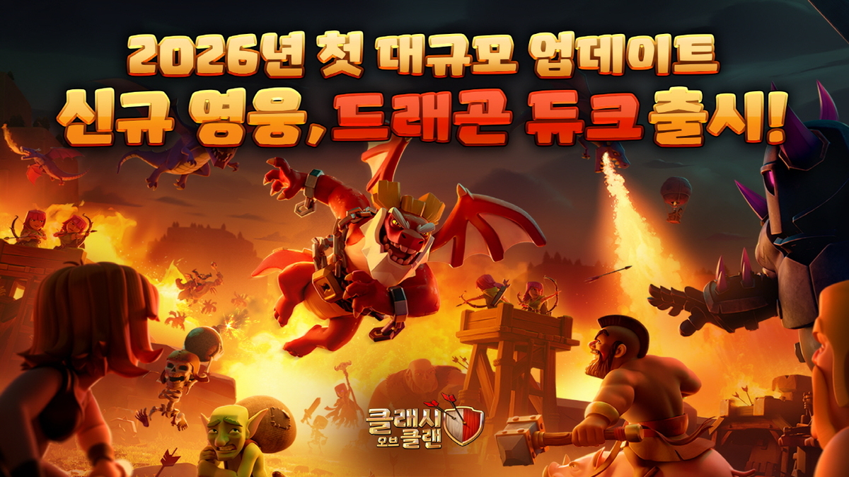 드래곤 듀크는 기본 장비 ‘불꽃 심장’과 ‘화염 풀무’를 장착한 상태로 해제되며, 추가 장비 ‘스턴 블래스터’를 통해 주변 적을 기절시키는 전술 운용도 가능하다. 이와 함께 영웅회관, 대장간, 프로필, 군대 화면 등 영웅 관련 UI도 6영웅 체계에 맞춰 전면 개편됐다.