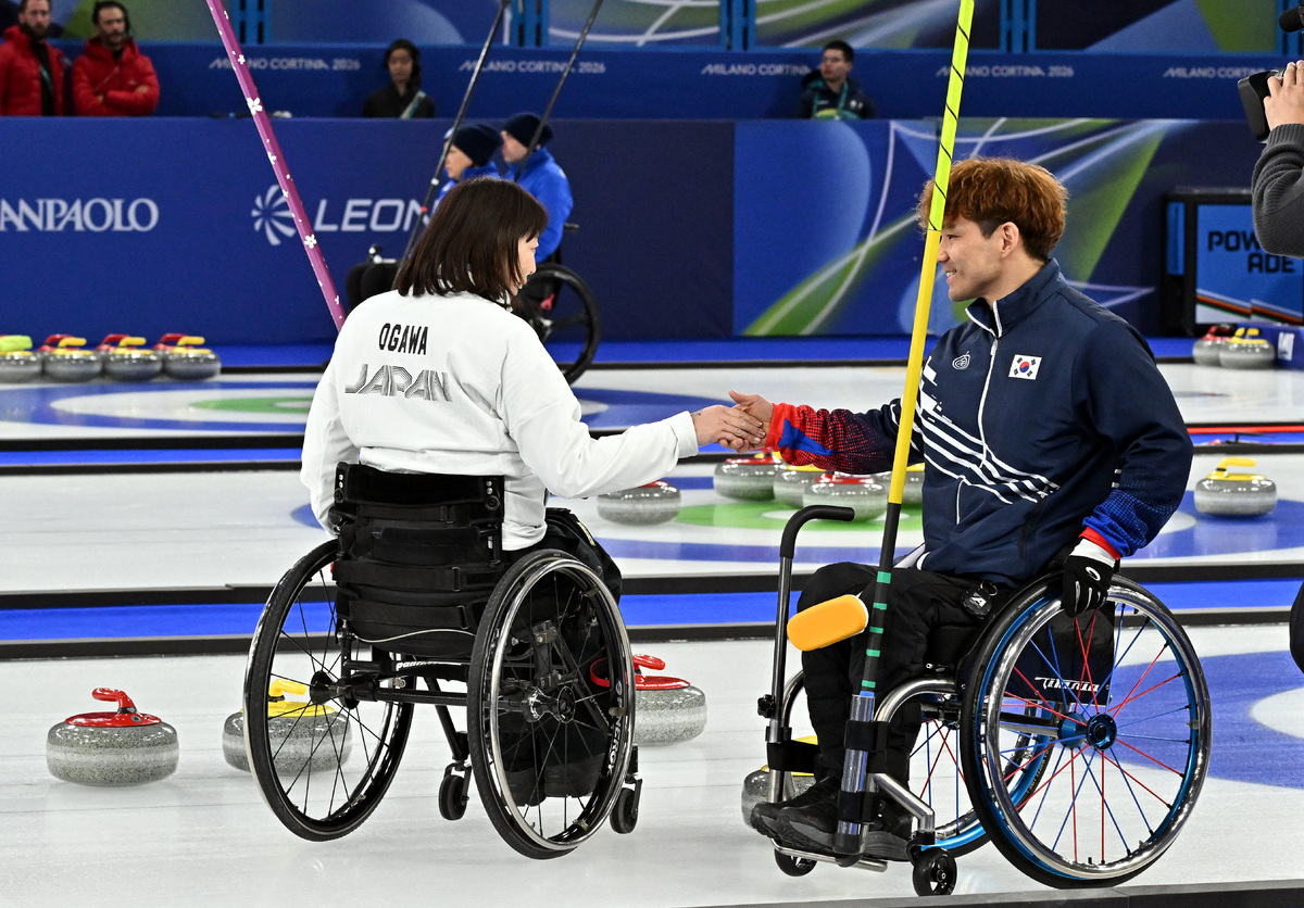 휠체어컬링 이용석(오른쪽)이 5일(현지시간) 이탈리아 코르티나담페초 델 기아초 컬링 올림픽 스타디움에서 열린 2026 밀라노 코르티나 패럴림픽 휠체어컬링 믹스더블 일본과의 예선전에서 승리한 뒤 상대 선수와 악수를 하고 있다. 코르티나=김두홍 기자 kimdh@sportsworldi.com 2026.03.06.