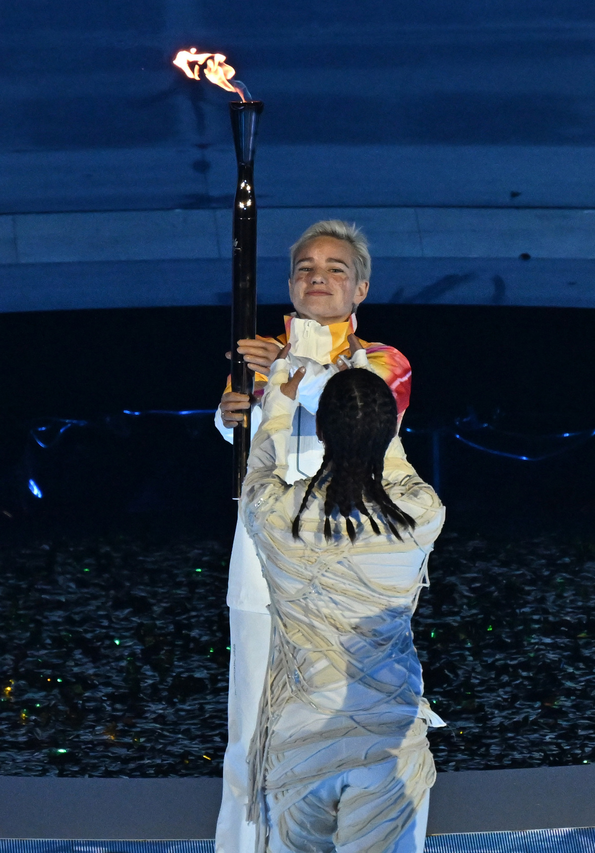 6일(현지시간) 이탈리아 아레나 디 베로나에서 열린 2026 밀라노 코르티나 동계패림픽 개회식에서 펜싱스타 베베 비오가 마지막 성화주자로 등장하고 있다. 2026.03.07. 베로나=사진공동취재단