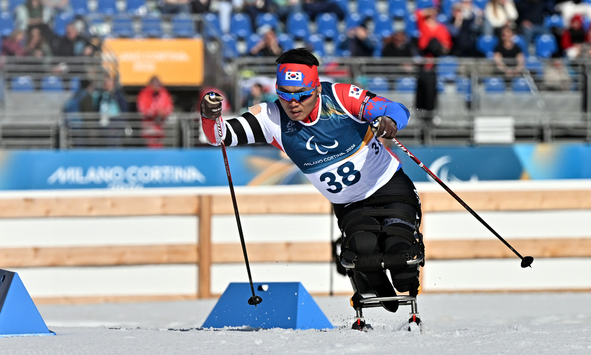 바이애슬론 신의현이 7일(현지시간) 이탈리아 테세로 크로스컨트리 스키 스타디움에서 열린 2026 밀라노 코르티나 동계패럴림픽 바이애슬론 남자 스프린트 좌식 7.5㎞ 경기에서 역주하고 있다. 테세로=김두홍 기자 kimdh@sportsworldi.com 2026.03.08.