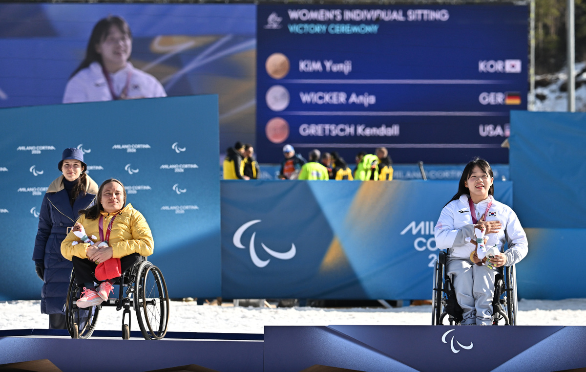바이애슬론 김윤지(가운데)가 8일(현지시간) 이탈리아 테세로 크로스컨트리 스키 스타디움에서 열린 2026 밀라노 코르티나 동계패럴림픽 바이애슬론 12.5km 시상식에서 국기에 대한 경례를 하고 있다. 테세로=김두홍 기자 kimdh@sportsworldi.com 2026.03.08.