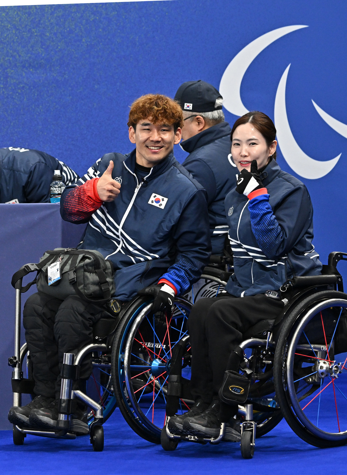 백혜진(오른쪽)과 이용석이 9일(현지시간) 이탈리아 코르티나담페초 컬링 올림픽 스타디움에서 열린 2026 밀라노 코르티나 패럴림픽 휠체어컬링 믹스더블 에스토니아와의 경기에서 승리 후 포즈를 취하고 있다. 코르티나(이탈리아)=김두홍 기자 kimdh@sportsworldi.com 2026.03.10.