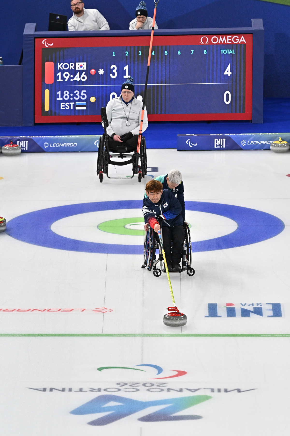 이용석이 9일(현지시간) 이탈리아 코르티나담페초 델 기아초 컬링 올림픽 스타디움에서 열린 2026 밀라노·코르티나 동계패럴림픽 휠체어컬링 믹스더블 에스토니아와의 예선전에서 스톤을 밀고 있다. 코르티나(이탈리아)=김두홍 기자 kimdh@sportsworldi.com 2026.03.10.