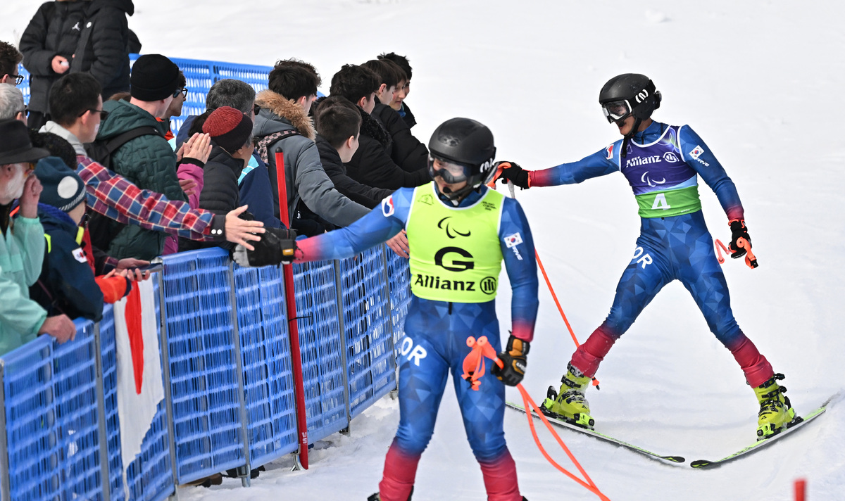 황민규(오른쪽)가 10일(현지시간) 이탈리아 코르티나담페초 토파네 알파인 스키 센터에서 열린 2026 밀라노 코르티나 패럴림픽 알파인스키 알파인 복합경기에서 넘어진 뒤 관중들의 격려를 받으며 내려오고 있다. 코르티나(이탈리아)=김두홍 기자 kimdh@sportsworldi.com 2026.03.10.