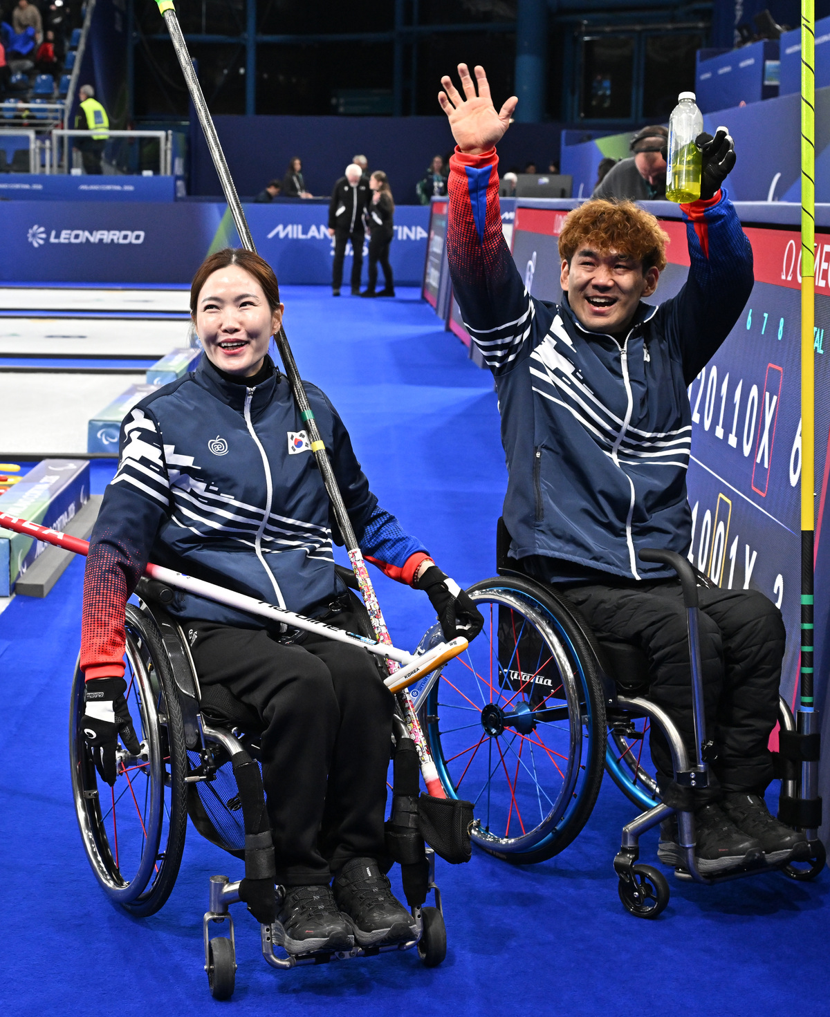 백혜진(왼쪽)과 이용석이 10일(현지시간) 이탈리아 코르티나담페초 컬링 올림픽 스타디움에서 열린 2026 밀라노 코르티나 패럴림픽 휠체어컬링 믹스더블 미국과의 준결승전에서 승리한 뒤 환호하는 팬들을 향해 인사를 하고 있다. 코르티나(이탈리아)=김두홍 기자 kimdh@sportsworldi.com 2026.03.11.