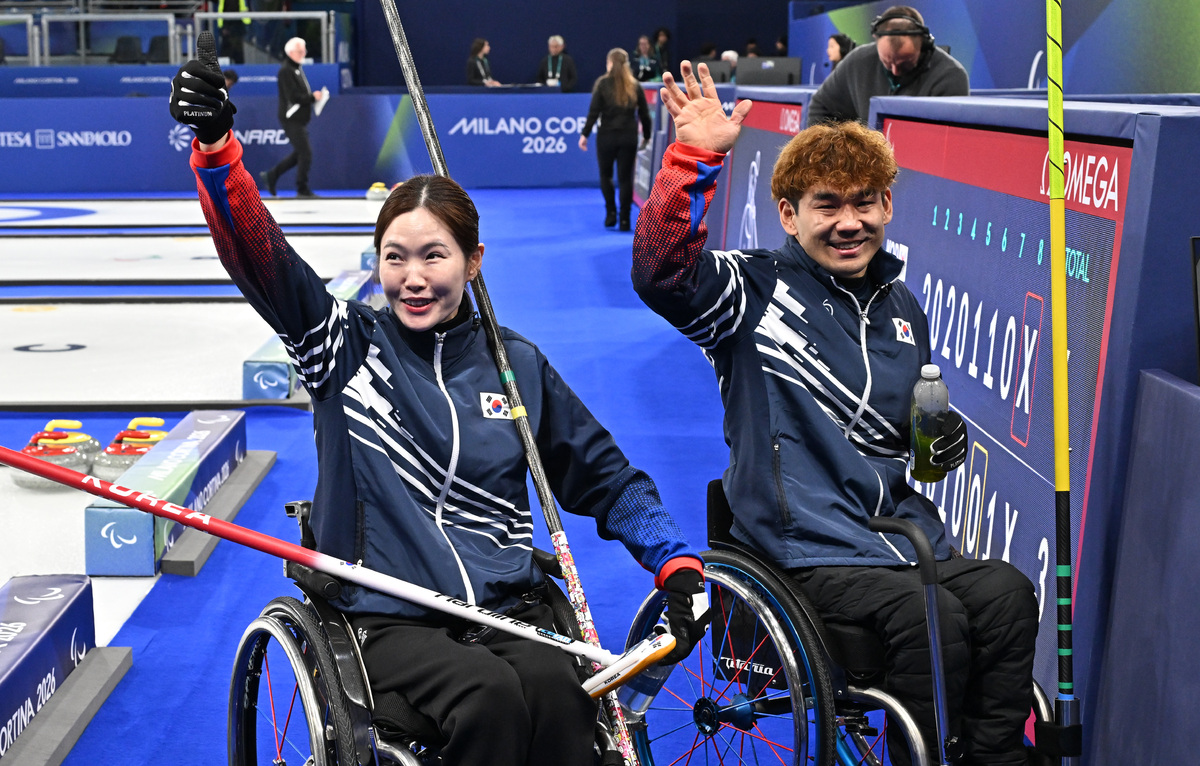 백혜진(왼쪽)과 이용석이 10일(현지시간) 이탈리아 코르티나담페초 컬링 올림픽 스타디움에서 열린 2026 밀라노 코르티나 패럴림픽 휠체어컬링 믹스더블 미국과의 준결승전에서 승리한 뒤 응원단을 향해 인사를 하고 있다. 코르티나(이탈리아)=김두홍 기자 kimdh@sportsworldi.com 2026.03.11.