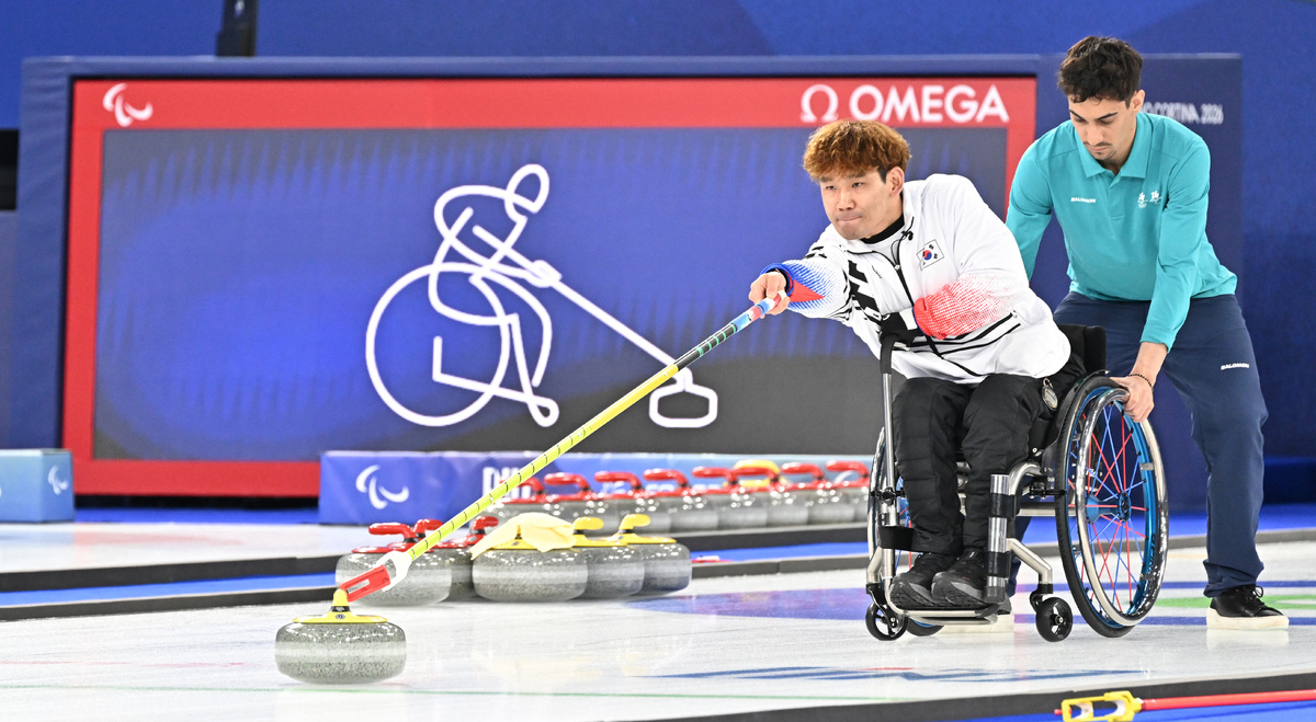 이용석이 11일(현지시간) 이탈리아 코르티나담페초 컬링 올림픽 스타디움에서 열린 2026 밀라노 코르티나 패럴림픽 휠체어컬링 믹스더블 중국과의 결승전에서 스톤을 밀고 있다. 코르티나(이탈리아)=김두홍 기자 kimdh@sportsworldi.com 2026.03.12.