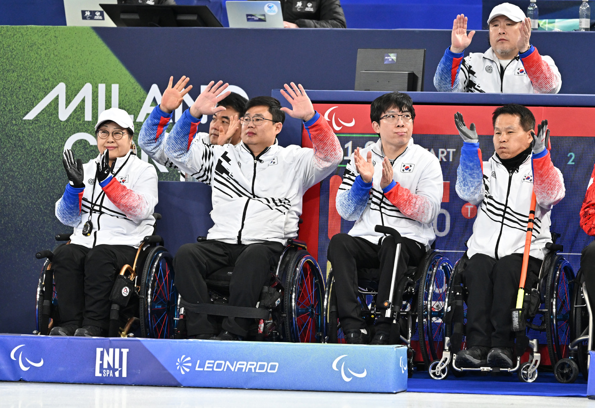 컬링 방민자, 이현출, 남봉광, 양희태(왼쪽부터)가 12일(현지시간) 이탈리아 코르티나담페초 컬링 올림픽 스타디움에서 열린 2026 밀라노 코르티나 패럴림픽 휠체어컬링 혼성 4인조 캐나다와의 예선전에 앞서 관중들에게 인사를 하고 있다. 코르티나(이탈리아)=김두홍 기자 kimdh@sportsworldi.com 2026.03.12.