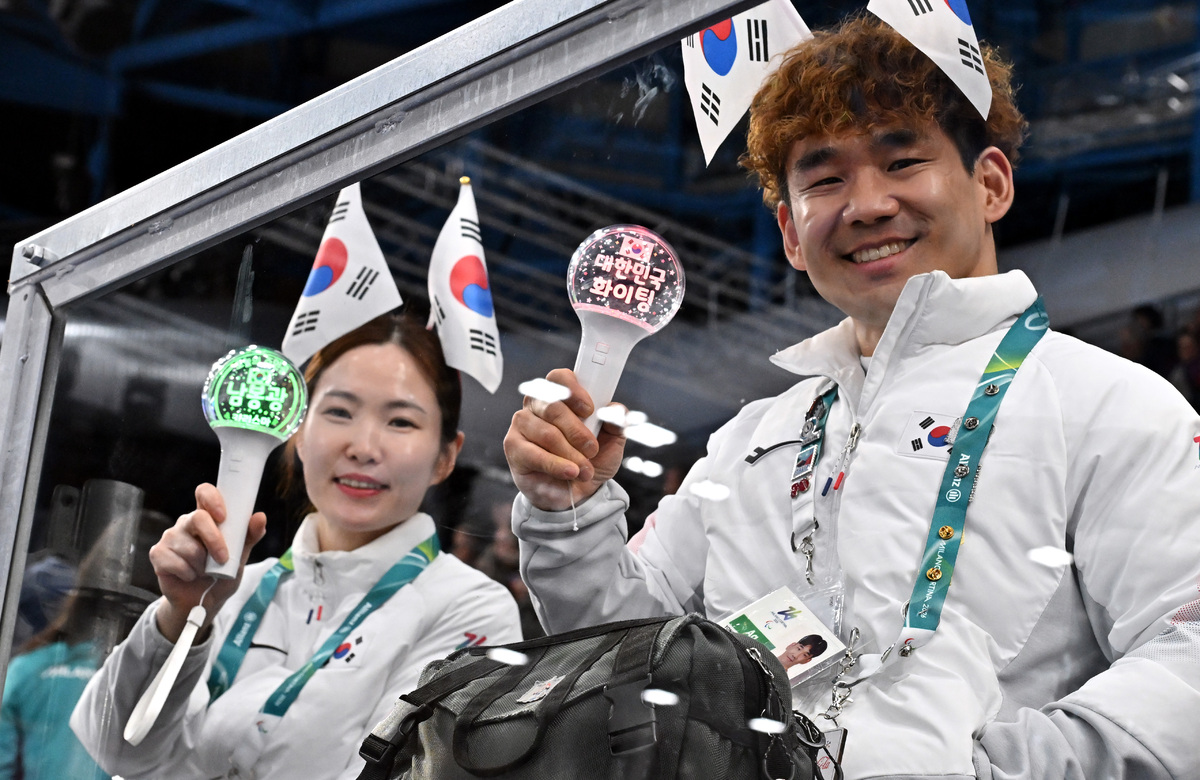 컬링 백혜진(왼쪽)과 이용석이 12일(현지시간) 이탈리아 코르티나담페초 컬링 올림픽 스타디움에서 열린 2026 밀라노 코르티나 패럴림픽 휠체어컬링 혼성 4인조 캐나다와의 예선전에서 응원을 하고 있다. 코르티나(이탈리아)=김두홍 기자 kimdh@sportsworldi.com 2026.03.12.