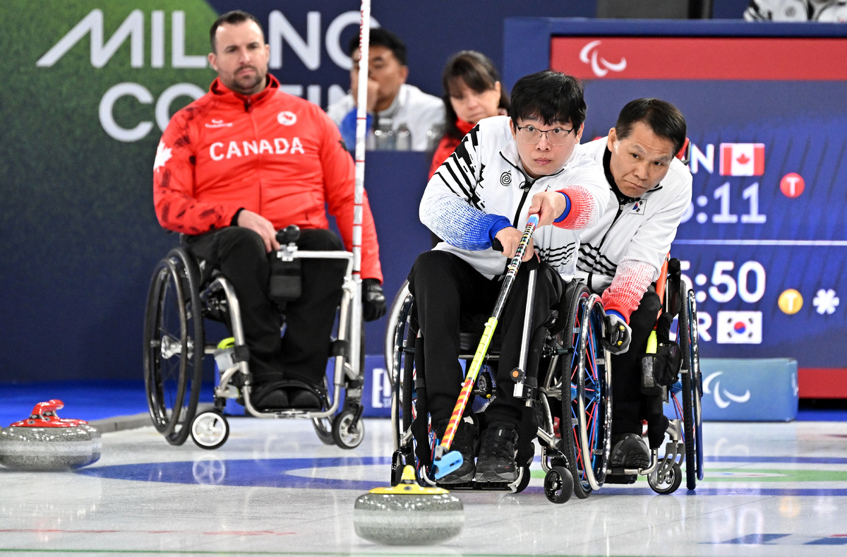 컬링 남봉광(가운데)이 12일(현지시간) 이탈리아 코르티나담페초 컬링 올림픽 스타디움에서 열린 2026 밀라노 코르티나 패럴림픽 휠체어컬링 혼성 4인조 캐나다와의 예선전에서 스톤을 힘차게 밀고 있다. 코르티나(이탈리아)=김두홍 기자 kimdh@sportsworldi.com 2026.03.12.