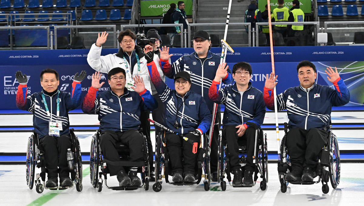 컬링 양희태, 이현출, 방민자, 남봉광, 차진호, 임성민 감독, 이충용 코치(아래 왼쪽부터 시계반대방향)가 12일(현지시간) 이탈리아 코르티나담페초 컬링 올림픽 스타디움에서 열린 2026 밀라노 코르티나 패럴림픽 휠체어컬링 혼성 4인조 이탈리아와의 예선전에서 승리 후 관중들에게 인사를 하고 있다. 코르티나(이탈리아)=김두홍 기자 kimdh@sportsworldi.com 2026.03.13.