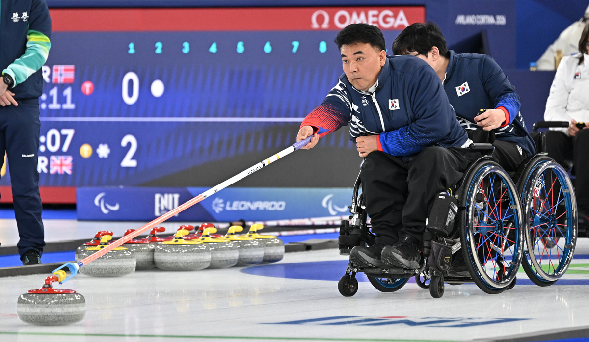 차진호가 12일(현지시간) 이탈리아 코르티나담페초 컬링 올림픽 스타디움에서 열린 2026 밀라노 코르티나 패럴림픽 휠체어컬링 혼성 4인조 이탈리아와의 예선전에서 힘차게 스톤을 밀고 있다. 코르티나(이탈리아)=김두홍 기자 kimdh@sportsworldi.com 2026.03.13.