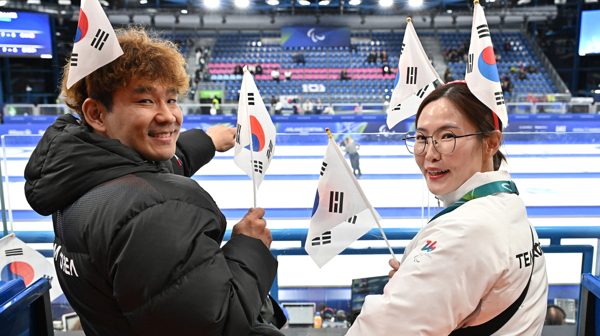 백혜진(오른쪽)과 이용석이 13일(현지시간) 이탈리아 코르티나담페초 컬링 올림픽 스타디움에서 열린 2026 밀라노 코르티나 패럴림픽 휠체어컬링 혼성 4인조 한국과 스웨덴의 동메달 결정전에서 태극기를 들고 응원을 하고 있다. 코르티나(이탈리아)=김두홍 기자 kimdh@sportsworldi.com 2026.03.14.