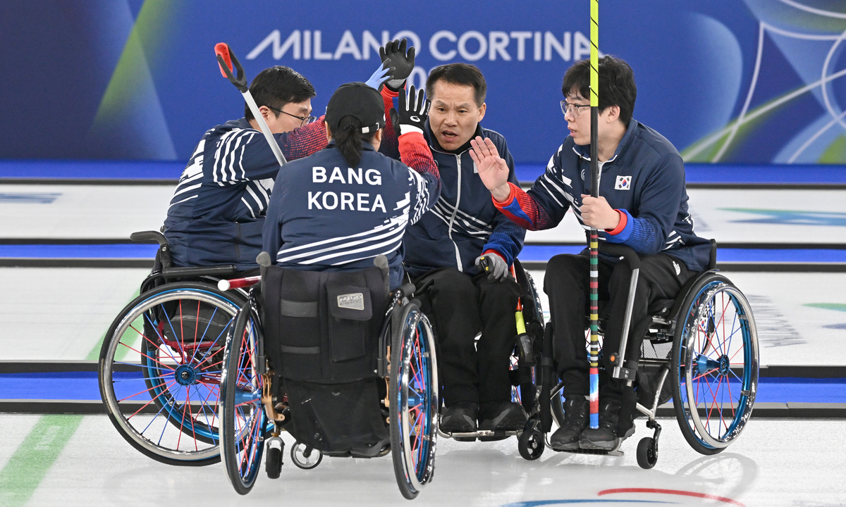 이현출, 방민자, 양희태, 남봉광(왼쪽부터)이 13일(현지시간) 이탈리아 코르티나담페초 컬링 올림픽 스타디움에서 열린 2026 밀라노 코르티나 패럴림픽 휠체어컬링 혼성 4인조 스웨덴과의 동메달 결정전에서 화이팅을 외치고 있다. 코르티나(이탈리아)=김두홍 기자 kimdh@sportsworldi.com 2026.03.14.