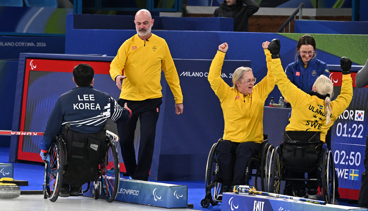 이현출(왼쪽)이 13일(현지시간) 이탈리아 코르티나담페초 컬링 올림픽 스타디움에서 열린 2026 밀라노 코르티나 패럴림픽 휠체어컬링 혼성 4인조 스웨덴과의 동메달 결정전에서 패한 뒤 상대와 악수를 하 있다. 코르티나(이탈리아)=김두홍 기자 kimdh@sportsworldi.com 2026.03.14.