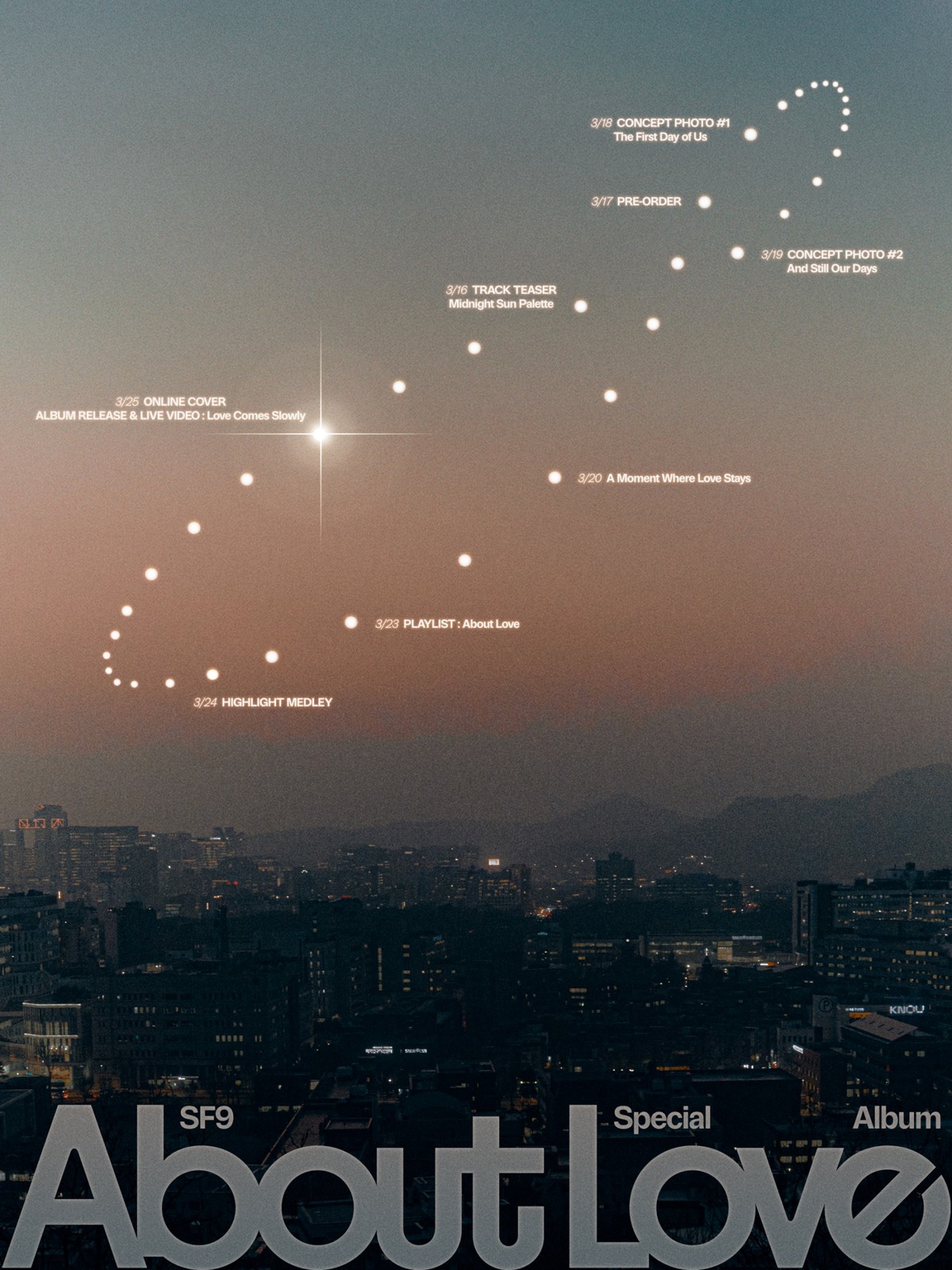 스케줄러에 따르면 SF9은 오는 16일 트랙 티저를 시작으로 콘셉트 포토, 하이라이트 메들리 등 다양한 콘텐츠를 순차적으로 오픈한다. 특히 ‘A Moment Where Love Stays’(어 모멘트 웨어 러브 스테이즈), ‘PLAYLIST : About Love’(플레이리스트 : 어바웃 러브)라는 제목의 콘텐츠가 예고돼 이번 앨범에 담긴 사랑 이야기에 대한 궁금증을 더한다. 앨범 발매 당일에는 ‘LIVE VIDEO : Love Comes Slowly’(라이브 비디오 : 러브 컴즈 슬로울리) 공개가 예정돼 있어 팬들의 기대감이 한층 높아지고 있다.