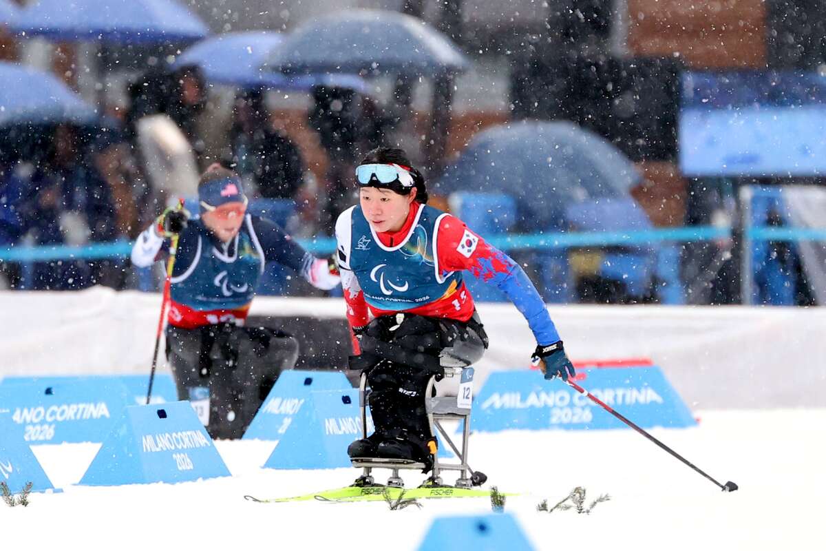 김윤지가 15일(현지시간) 이탈리아 테세로 크로스컨트리 스키 스타디움에서 열린 2026 밀라노·코르티나담페초 동계 패럴림픽 크로스컨트리 스키 여자 20㎞ 인터벌 스타트 좌식 경기에서 레이스를 펼치고 있다. 사진=대한장애인체육회 제공
