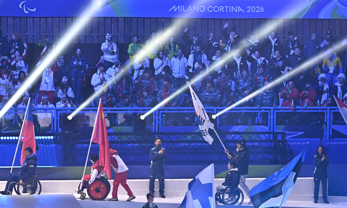 휠체어컬링 백혜진과 스노보드 이제혁이 15일(현지시간) 이탈리아 코르티나담페초 컬링 올림픽 스타디움에서 열린 2026 밀라노 코르티나 패럴림픽 폐막식에서 태극기를 들고 입장하고 있다. 코르티나(이탈리아)=김두홍 기자 kimdh@sportsworldi.com 2026.03.16.