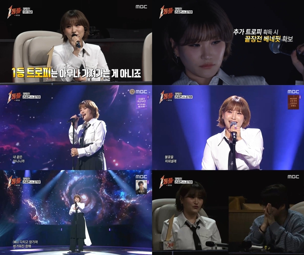 지난 15일 방송된 MBC '1등들'에서 손승연은 두 번째 맞짱전에 출전했다. 지난주 줄세우기전에서 3등으로 맞짱전에 올라오며 두 번째 트로피를 노리는 손승연은 첫 번째 맞짱전에서 1등 자리를 두고 박빙의 승부를 펼쳤던 김기태와의 맞대결이 성사됐다.