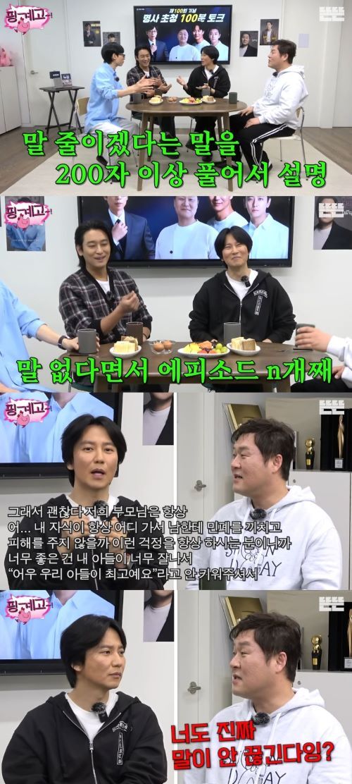 지난 14일 유튜브 채널 ‘뜬뜬 DdeunDdeun’에 ‘100분 토크는 핑계고’가 올라왔다. 영상은 유재석이 지인들과 다양한 주제로 자유롭게 수다를 떠는 토크 콘텐츠 ‘핑계고’의 100회를 기념했다. 여기에 특별한 게스트들을 초대했다. 함께한 게스트는 말이 많기로 유명한 세 명의 배우, 김남길, 윤경호, 주지훈이었다. 여기에 진행자 유재석까지 총 네 명이 오디오가 빌 틈 없이 대화를 나눠 이슈가 됐다.