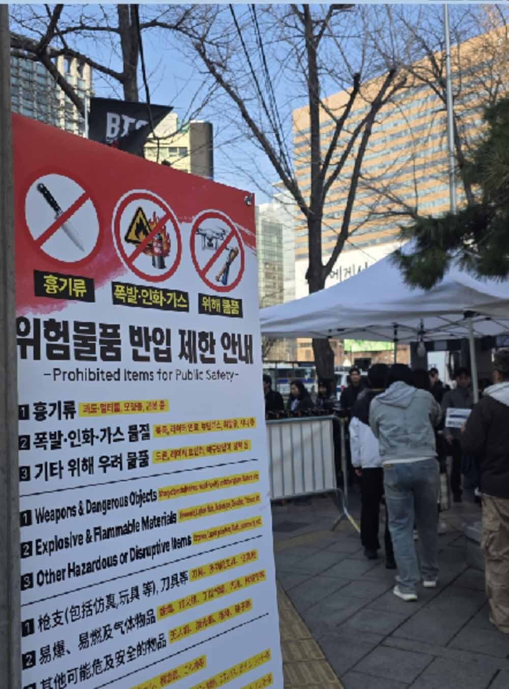 [SW포토]BTS공연, 위험물 반입 금지 기사입력 2026-03-21 16:04:35 기사수정 2026-03-21 16:41:53 글씨 크기 선택 가장 작은 크기 글자 한 단계 작은 크기 글자 기본 크기 글자 한 단계 큰 크기 글자 가장 큰 크기 글자 방탄소년단(BTS) 컴백 공연 당일인 21일 서울 종로구 광화문광장이 BTS 팬들로 붐비고 있다. 김두홍 기자 kimdh@sportsworldi.com [ⓒ 세계비즈앤스포츠월드 & sportsworldi.com, 무단전재 및 재배포 금지] 메뉴보기 페이스북 공유 트위터 공유 url 공유 더보기