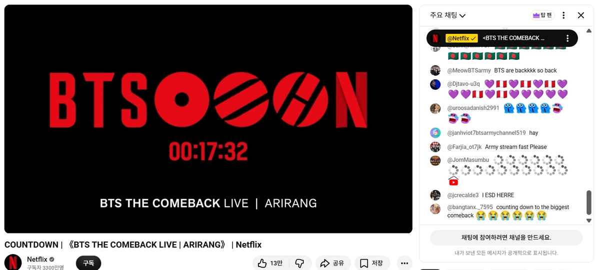 넷플릭스는 21일 오후 유튜브 채널 넷플릭스 코리아를 통해 ‘팬 대기실 <BTS 컴백 라이브: ARIRANG> 카운트다운’ 영상을 공개하고 라이브 채팅창을 개설했다.