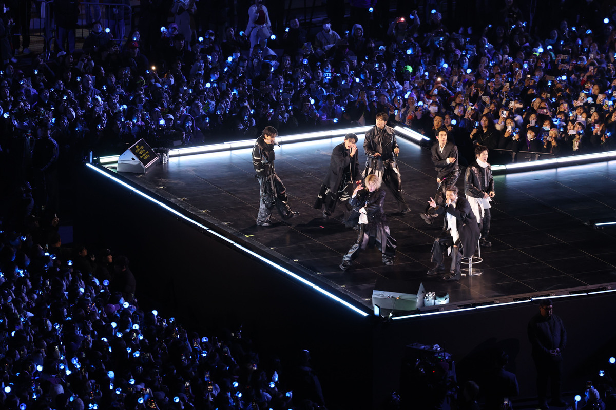 방탄소년단(BTS)이 21일 서울 광화문광장에서 컴백 기념 공연인 'BTS 컴백 라이브: 아리랑'을 펼치고 있다.