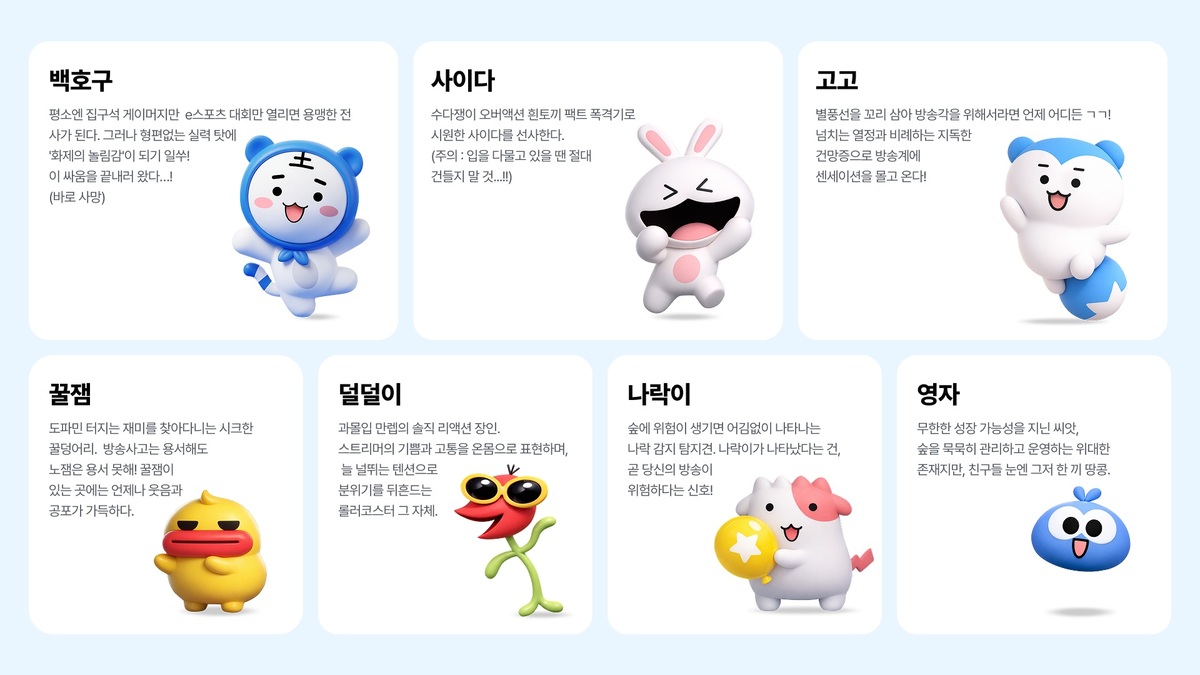 ‘수퍼스타즈’는 SOOP 내 다양한 콘텐츠 카테고리를 반영해 기획됐다. 기존 캐릭터 ‘백호구’, ‘사이다’, ‘꿀잼’에 더해 버추얼 콘텐츠를 상징하는 다람쥐 ‘고고’, 음악 콘텐츠 기반의 식물 캐릭터 ‘덜덜이’, 보이는 라디오를 모티브로 한 강아지 ‘나락이’가 새롭게 합류했다. 여기에 세계관의 중심 서사를 이끄는 캐릭터 ‘영자’를 더해 스토리 구조를 완성했다.