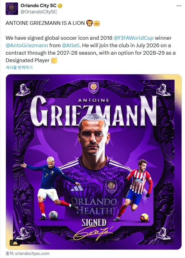 MLS 올랜도 시티는 25일 스페인 아틀레티코 마드리드에서 뛰는 그리즈만과의 계약을 공식 발표했다. 계약 기간은 오는 7월부터 2년이다. 2028~2029시즌은 구단 옵션이 걸려있어 구단이 계약 연장 여부를 결정할 수 있다.