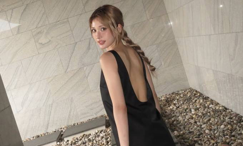 화이트 삭스와 스니커즈를 매치해 활동성과 캐주얼한 무드를 더했으며, 슬림한 실루엣과 어우러진 백리스 디자인이 시크하면서도 세련된 매력을 강조했다. 카메라를 응시하는 모습에서는 특유의 당당한 아우라가 돋보인다.
