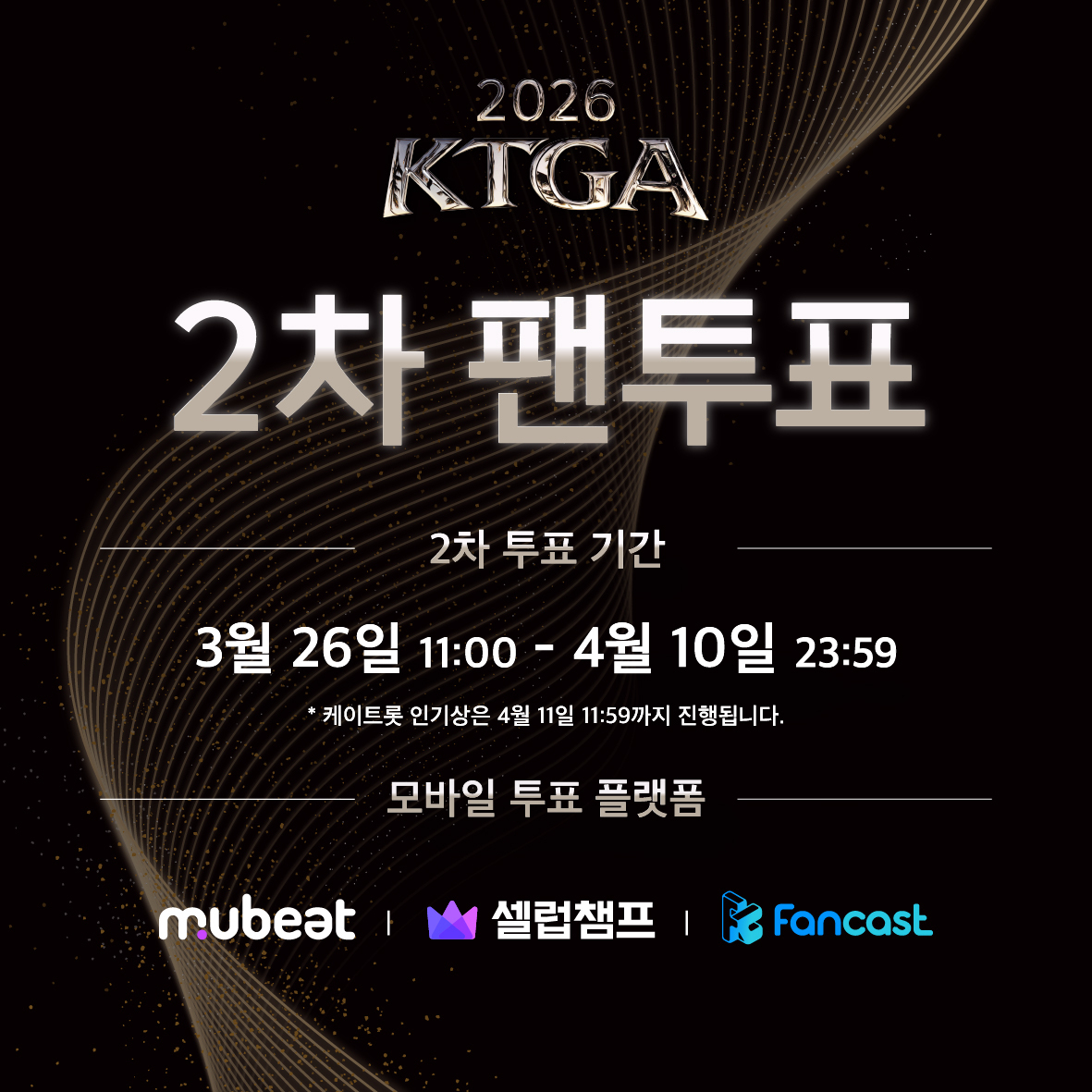 2차 투표는 26일 오전 11시부터 4월 10일 23시 59분까지 진행되며 실질적인 최종 순위를 결정짓는 핵심 라운드다. 팬들의 적극적인 참여 여부에 따라 결과가 완전히 뒤집힐 수 있어 긴장감이 최고조에 달하고 있다.