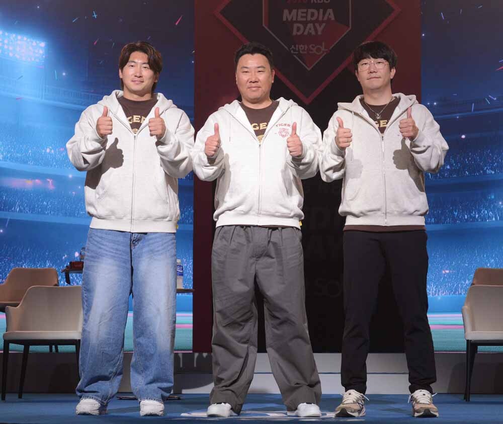 프로야구 KIA 나성범, 이범호 감독, 양현종(왼쪽부터)이 26일 서울 송파구 롯데호텔 월드에서 열린 ‘2026 신한 SOL KBO 리그 개막 미디어데이’에서 입장하고 있다. 사진=김두홍 기자 kimdh@sportsworldi.com