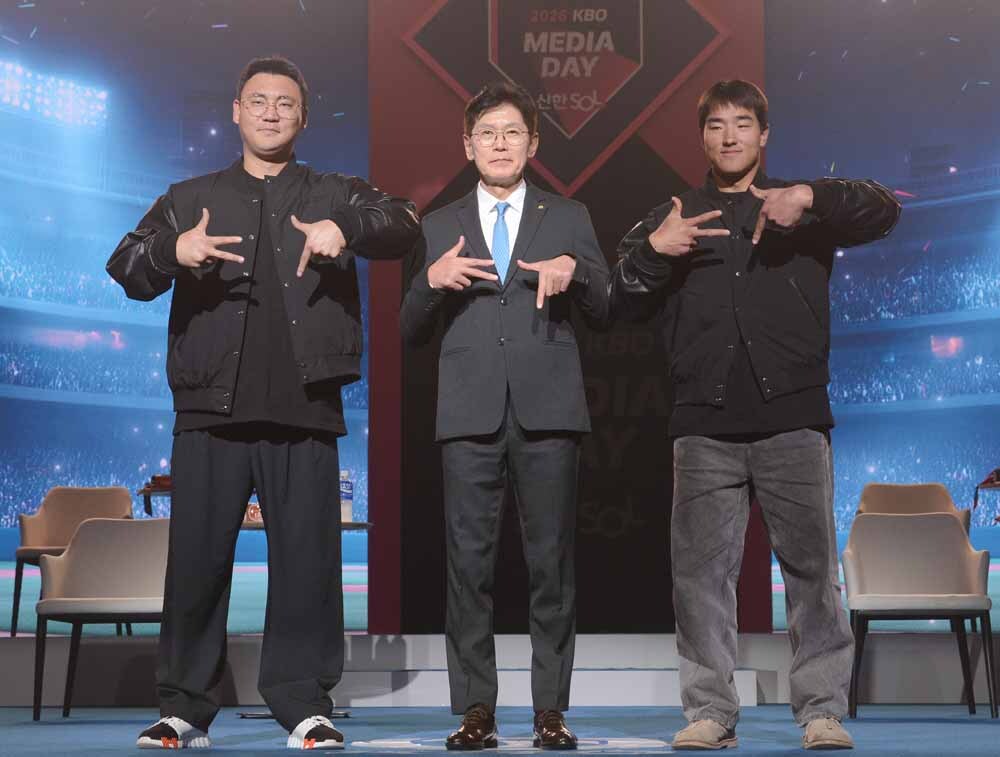 프로야구 KT 장성우, 이강철 감독, 안현민(왼쪽부터)이 26일 서울 송파구 롯데호텔 월드에서 열린 ‘2026 신한 SOL KBO 리그 개막 미디어데이’에서 입장하고 있다. 사진=김두홍 기자 kimdh@sportsworldi.com