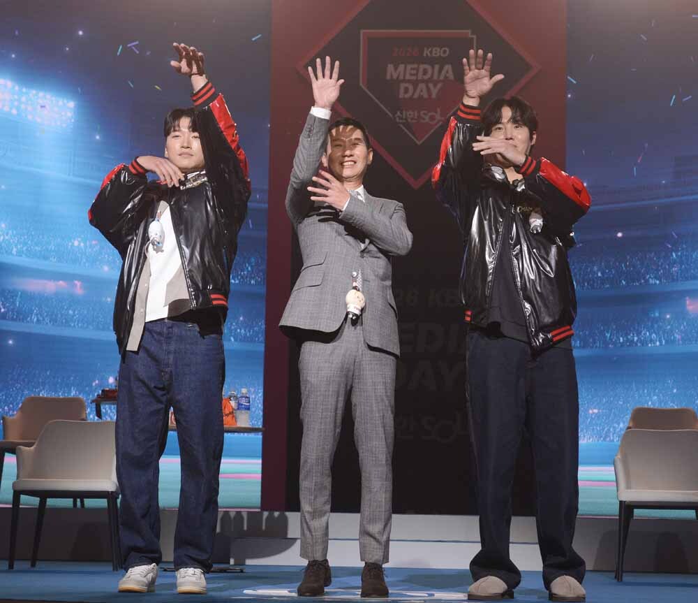 프로야구 LG 박해민, 염경엽 감독, 임찬규(왼쪽부터)가 26일 서울 송파구 롯데호텔 월드에서 열린 ‘2026 신한 SOL KBO 리그 개막 미디어데이’에서 입장하고 있다. 사진=김두홍 기자 kimdh@sportsworldi.com