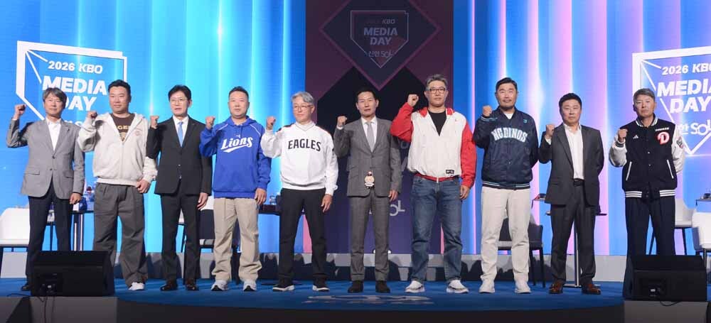 프로야구 키움 설종진 감독, KIA 이범호 감독, KT 이강철 감독, 삼성 박진만 감독, 한화 김경문 감독, LG 염경엽 감독, SSG 이숭용 감독, NC 이호준 감독, 롯데 김태형 감독, 두산 김원형 감독(왼쪽부터)이 26일 서울 송파구 롯데호텔 월드에서 열린 ‘2026 신한 SOL KBO 리그 개막 미디어데이’에서 기념촬영을 하고 있다. 사진=김두홍 기자 kimdh@sportsworldi.com