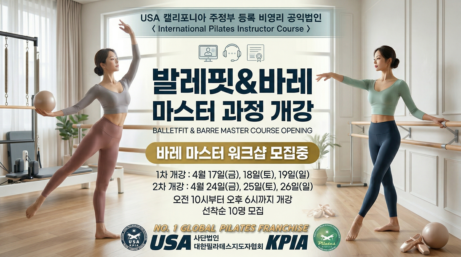 사단법인 대한필라테스지도자협회(KPIA Pilates USA)가 오는 4월 발레핏&바레 지도자 과정 개강 소식을 알리며 ‘KPIA 바레 마스터 코스 워크샵’ 참가자를 모집한다고 27일 밝혔다.