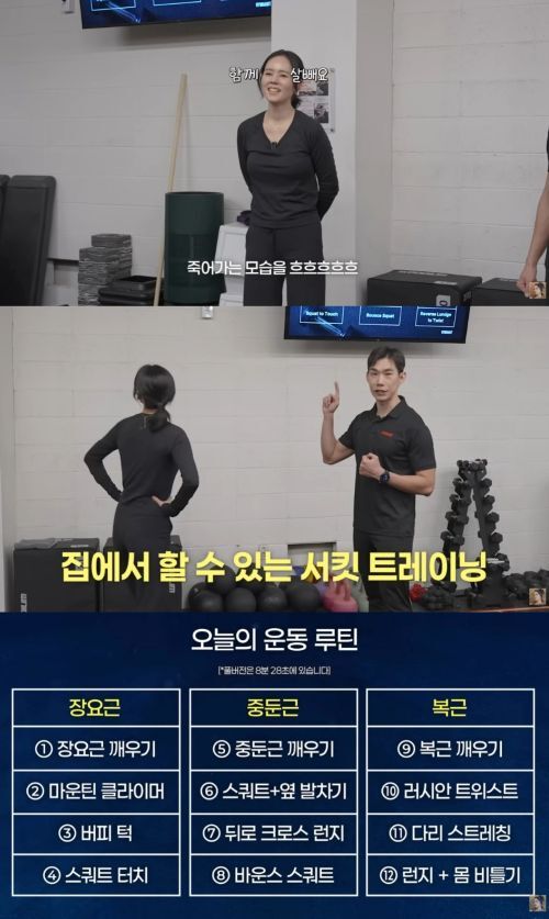 한가인은 “드디어 살을 뺄 계절이 왔다”며 실제로 다니는 헬스장에서 코치와 함께 운동을 진행했다. 코치는 집에서 할 수 있는 서킷 트레이닝 장요근, 중둔근, 복근에 집중하는 코스를 소개했다.