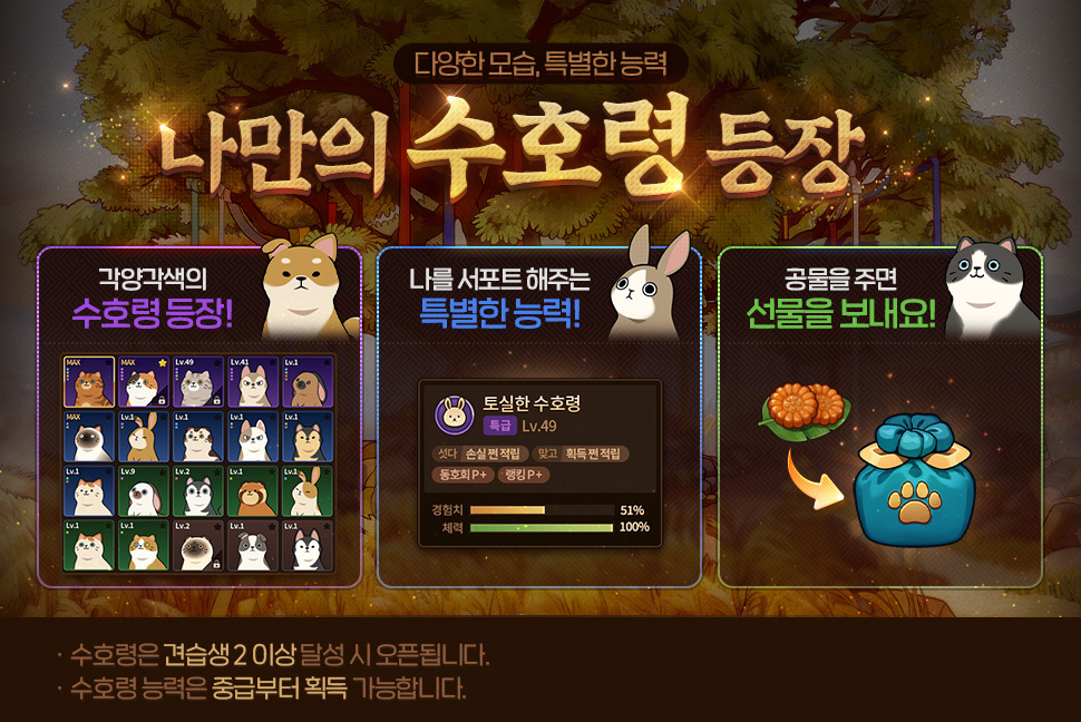 이번에 새롭게 도입된 수호령은 다양한 혜택을 제공하는 일종의 ‘펫’과 같은 동반자 콘텐츠다. 랭킹전에서 일정 등급(견습생 II)을 달성한다면 누구나 자신만의 수호령을 소환할 수 있다. 수호령은 고양이, 강아지, 토끼 등 친숙한 3종의 동물을 바탕으로 패턴과 색상의 조합을 통해 무궁무진한 각기 다른 외형으로 제공된다.