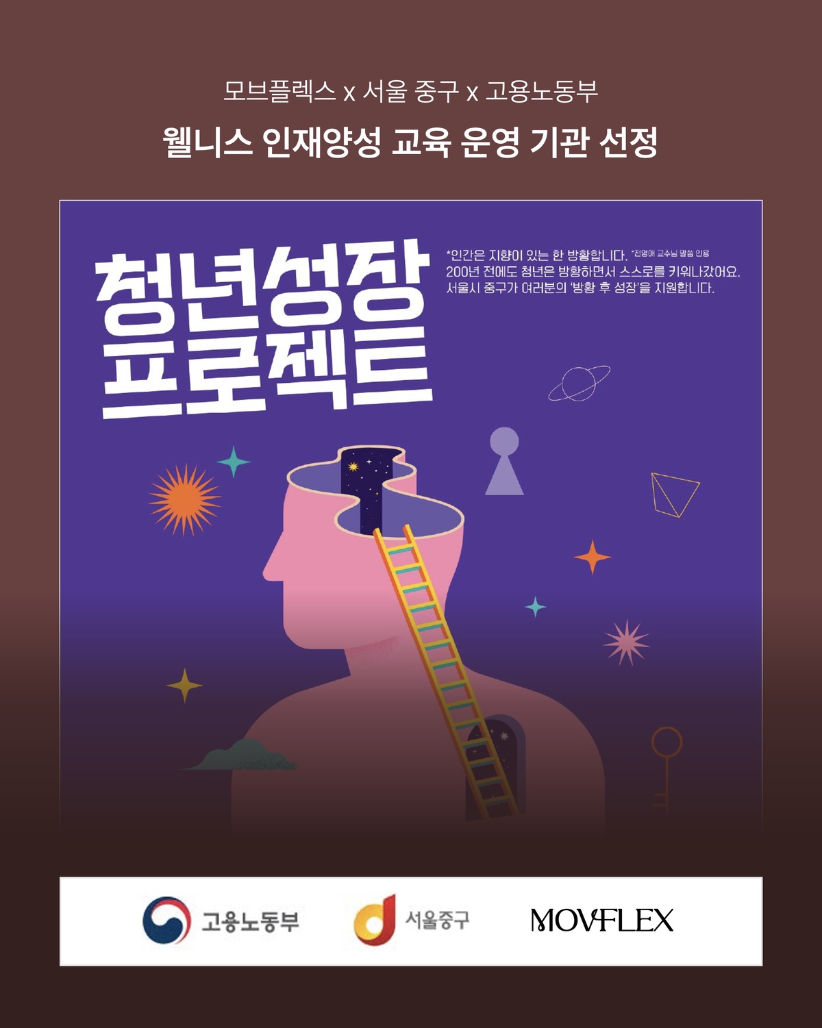 모브플렉스(MOVFLEX)는 서울 중구와 고용노동부가 공동 추진하는 ‘청년성장프로젝트’의 웰니스 분야 교육 운영기관으로 웰니스 브랜드가 공식 선정됐다고 31일 밝혔다.