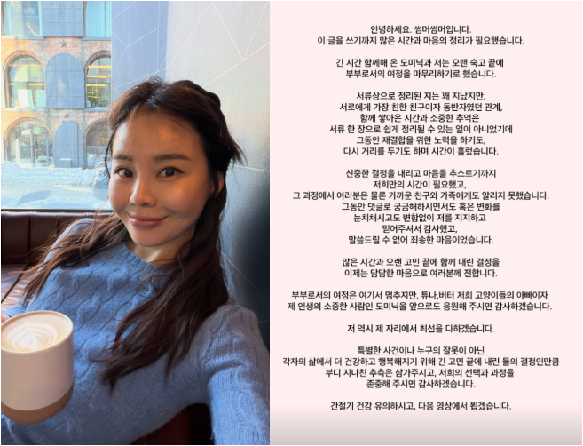썸머썸머는 “긴 시간 함께해 온 도미닉과 저는 오랜 숙고 끝에 부부로서의 여정을 마무리하기로 했다”며 “서류상으로 정리된 지는 꽤 지났지만 서로에게 가장 친한 친구이자 동반자였던 관계, 함께 쌓아온 시간과 소중한 추억은 서류 한 장으로 쉽게 정리될 수 있는 일이 아니었기에 그동안 재결합을 위한 노력을 하기도, 다시 거리를 두기도 하며 시간이 흘렀다”고 밝혔다.