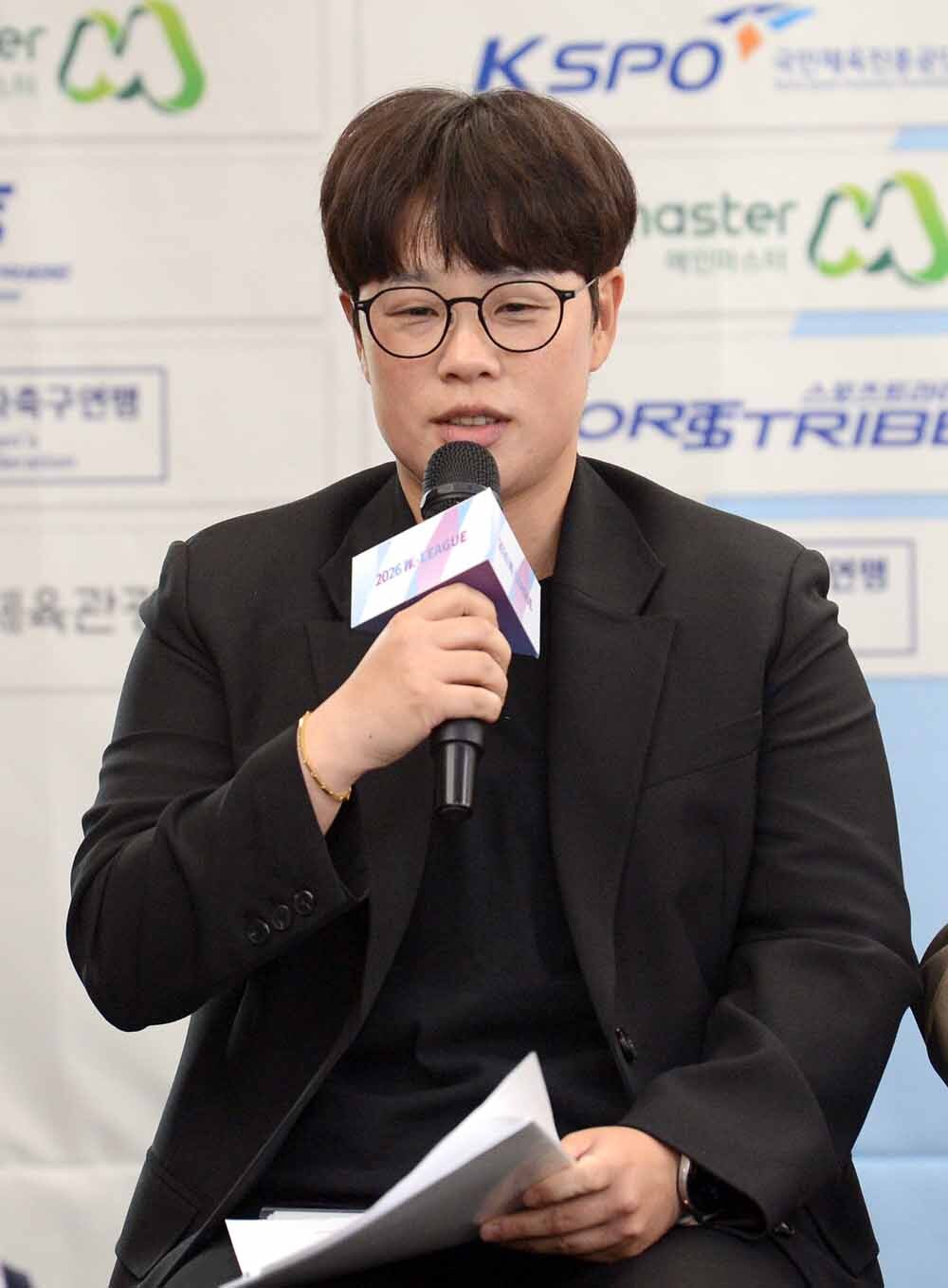여자축구 화천KSPO 이새움 코치가 1일 서울 송파구 올림픽파크텔에서 열린 '2026 WK리그 미디어데이' 질문에 답하고 있다. 사진=김두홍 기자 kimdh@sportsworldi.com
