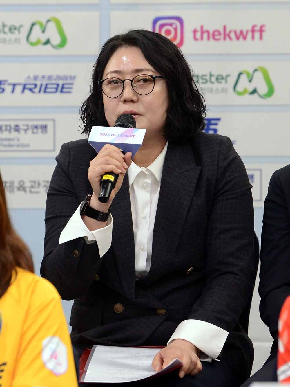 여자축구 상무여자축구단 이미연 감독이 1일 서울 송파구 올림픽파크텔에서 열린 '2026 WK리그 미디어데이'에서 질문에 답하고 있다. 사진=김두홍 기자 kimdh@sportsworldi.com
