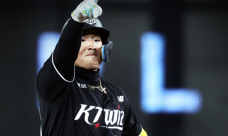프로야구 KT는 1일 대전 한화생명 볼파크에서 2026 신한 SOL KBO리그 정규리그 한화의 원정경기를 치르고 있다. 1회 초 기분 좋은 출발을 끊었다. 3번타자 겸 우익수로 선발 출전한 안현민이 상대 선발투수 류현진에 맞서 기선을 제압하는 솔로포를 친 것. 8구까지 가는 풀카운트 승부 끝에 높게 형성된 시속 146㎞ 직구를 공략해 중견수 뒤 담장을 넘겼다.