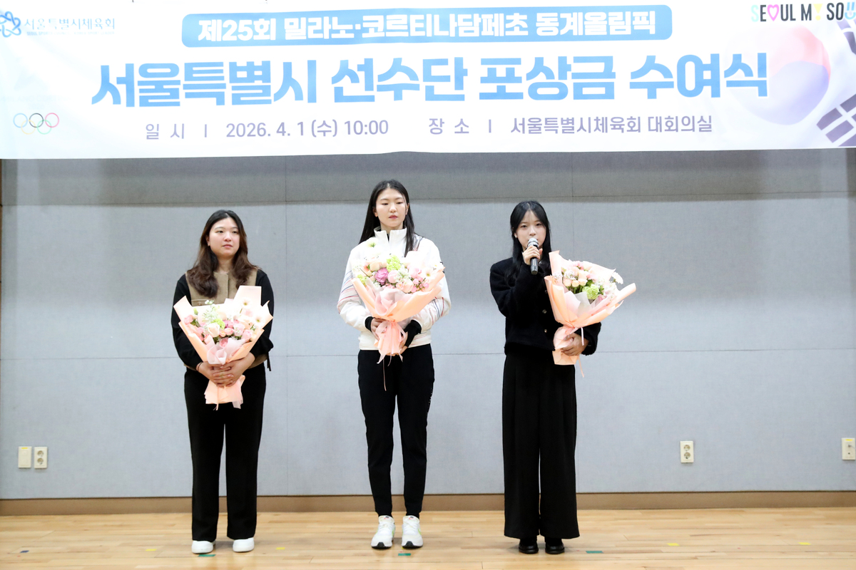 서울특별시체육회가 밀라노·코르티나담페초 동계올림픽 금메달 주역인 최가온(세화여고)과 심석희(서울시청), 쇼트트랙 손하경 코치(서울시청)를 초청해 포상금을 전달했다.